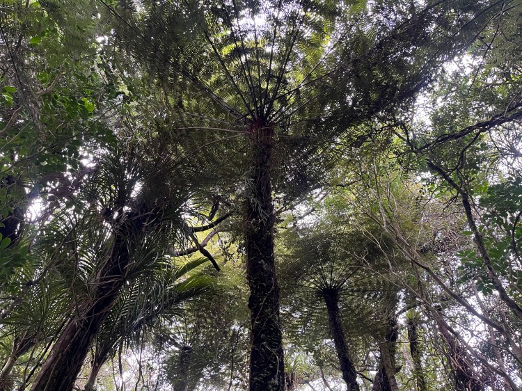 If you can believe it, these are ferns! They grow as big as small trees here, maybe 10-15 feet tall! There are the undergrowth in the forests, with the large fronds lying on the ground that have dropped off. The air is very humid, and the ground is mushy, and muddy, and slippery with moss. There are basically no predators in New Zealand, which is one of the reasons why I feel so safe hiking here. There are no large animals at all. I really only see birds, so many birds.