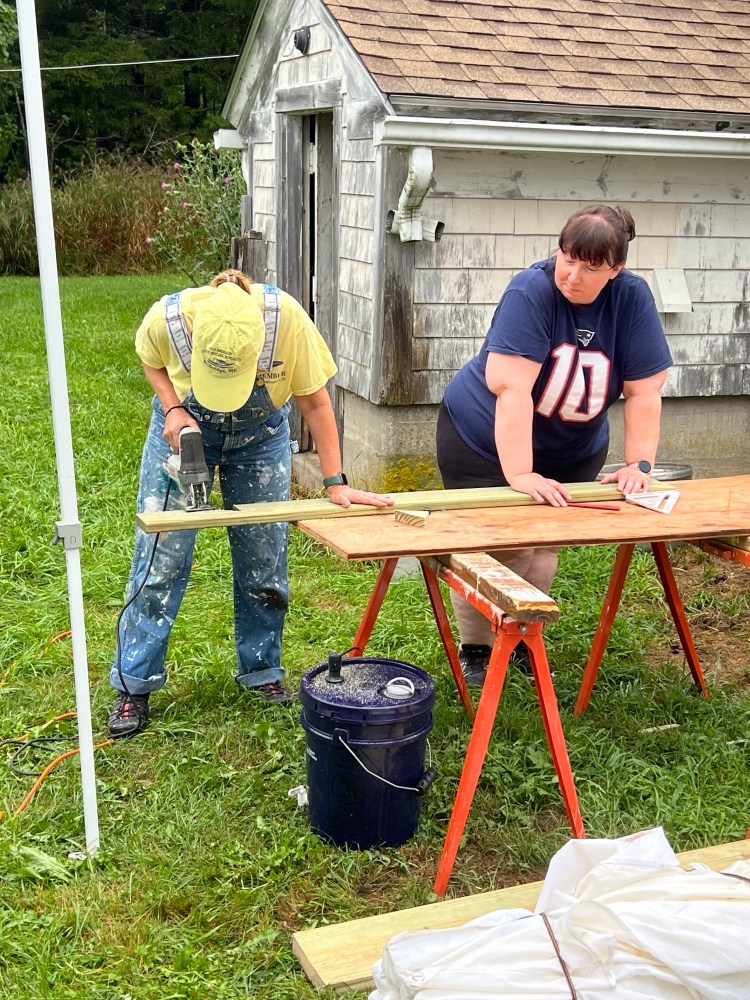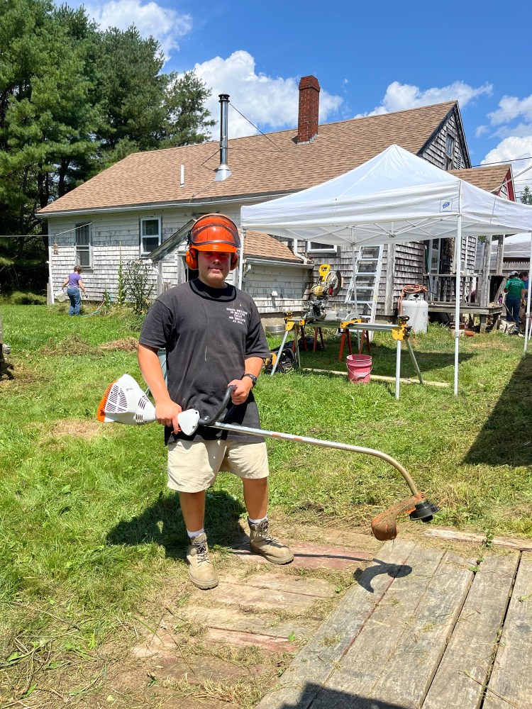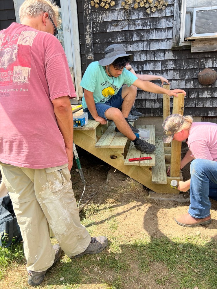 Our group this week is part of a home repair program for the Downeast Maine area, for seniors and people with disabilities, to work on outdoor projects that will make their homes safer and and more manageable. On Monday and Tuesday, so far we have: Tore down and rebuilt the side stairs, stained and painted the front porch and steps, replaced the storm door, stacked the firewood in the shed, Weedwacked the yard, weeded the gardens, disassembled the old chicken coop for the landfill, and generally made the place look great! Mary and Mark were SO gracious and lovely and appreciative.